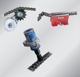 Chain for special applications used for lifting applications,curved drives, and pin gear drives.Chain peripheral products that meet the needs of chainmaintenance. Chain tensioners for adjusting chain slack,cutting/connecting tools, end fixtures, automatic lubricators,
