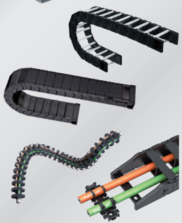 Mechanical carriers that protect and guide moving cables and hoses.